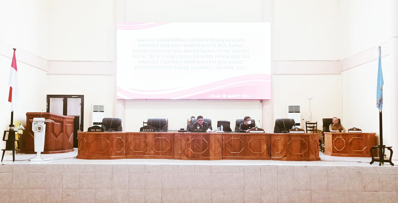 BOLMONG POST – Dewan Perwakilan Rakyat Daerah (DPRD), Kabupaten Bolaang Mongondow (Bolmong), menggelar sidang paripurna dalam rangka penetapan hasil reses anggota dewan, masa sidang 1 tahun 2022.