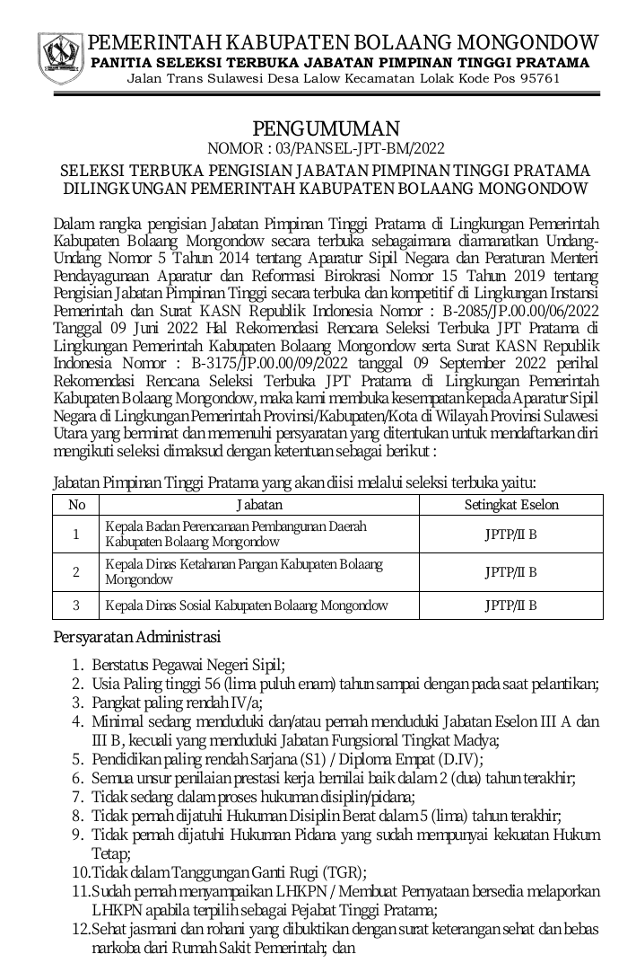 Pengumuman tersebut sesuai dengan nomor : 03/PANSEL-JPT-BM/2022, dan rekomendasi Surat KASN Republik Indonesia (RI), B-3175/JP.00.00/09/2022, tertanggal 09 September 2022.Berikut pengumuman seleksi terbuka pengisian jabatan pimpinan tinggi pratama dilingkungan Pemkab Bolmong: