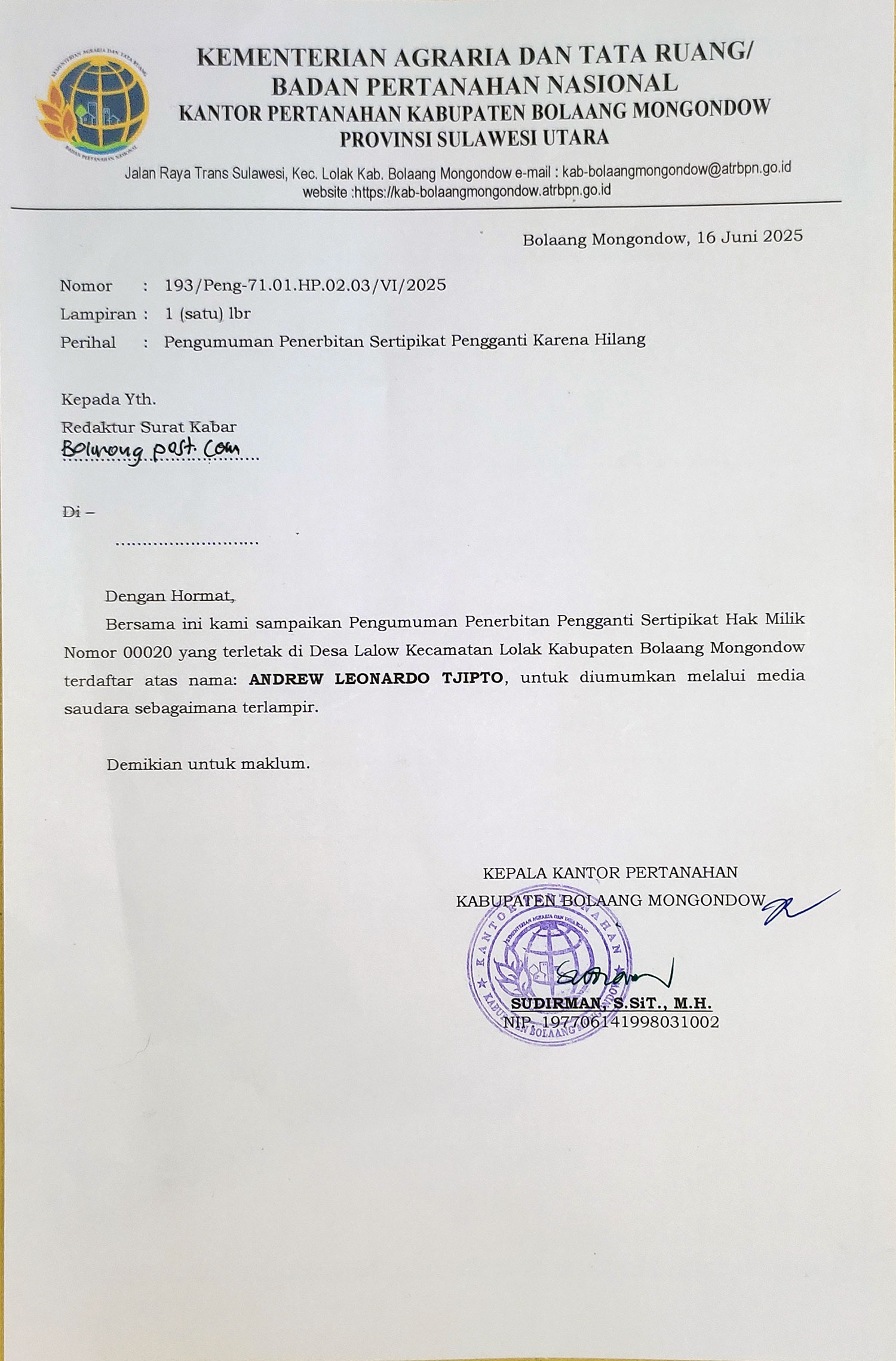 BolmongPost – Kantor Pertanahan Kabupaten Bolaang Mongondow resmi mengumumkan proses penerbitan sertifikat pengganti atas sertifikat Hak Milik yang hilang milik Andrew Leonardo Tjipto, sebagaimana tertuang dalam pengumuman resmi bernomor: 193/Peng-71.01.HP.02.03/VI/2025.
