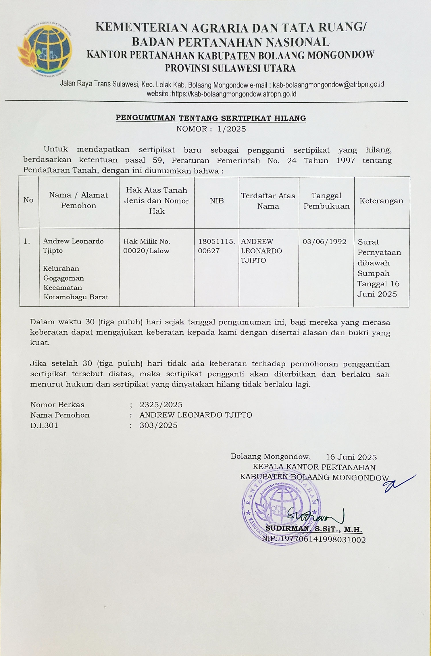 Sertifikat yang dimaksud adalah Hak Milik No. 00020/Lalow, yang tercatat atas nama Andrew Leonardo Tjipto, warga Kelurahan Gogagoman, Kecamatan Kotamobagu Barat. Sertifikat tersebut sebelumnya dibukukan sejak tanggal 3 Juni 1992, dan kini dinyatakan hilang berdasarkan surat pernyataan di bawah sumpah tertanggal 16 Juni 2025.