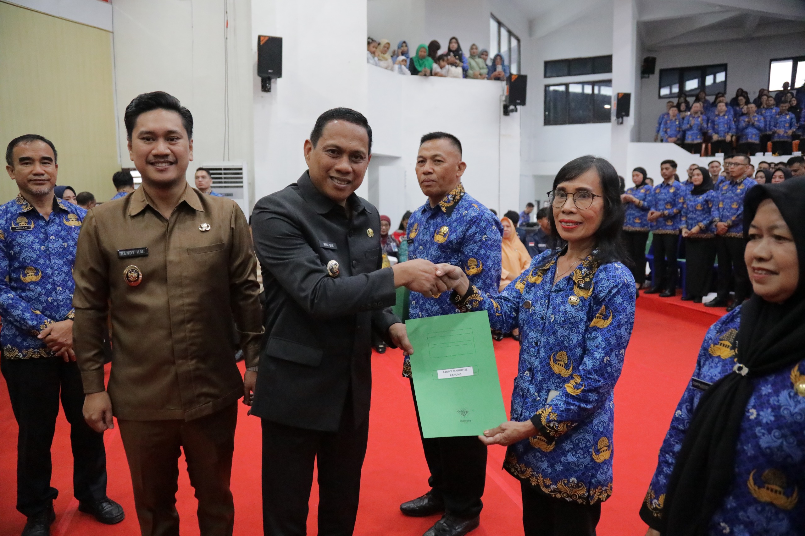 BOLMONG POST-Wali Kota Kotamobagu, dr. Weny Gaib, didampingi Wakil Wali Kota Kotamobagu, Rendy Virgiawan Mangkat, Selasa 17 Juni tahun 2025 menyerahkan Surat Keputusan (SK) Pengangkatan 422 Pegawai Pemerintah dengan Perjanjian Kerja (PPPK) dilingkungan Pemerintah Kota Kotamobagu.